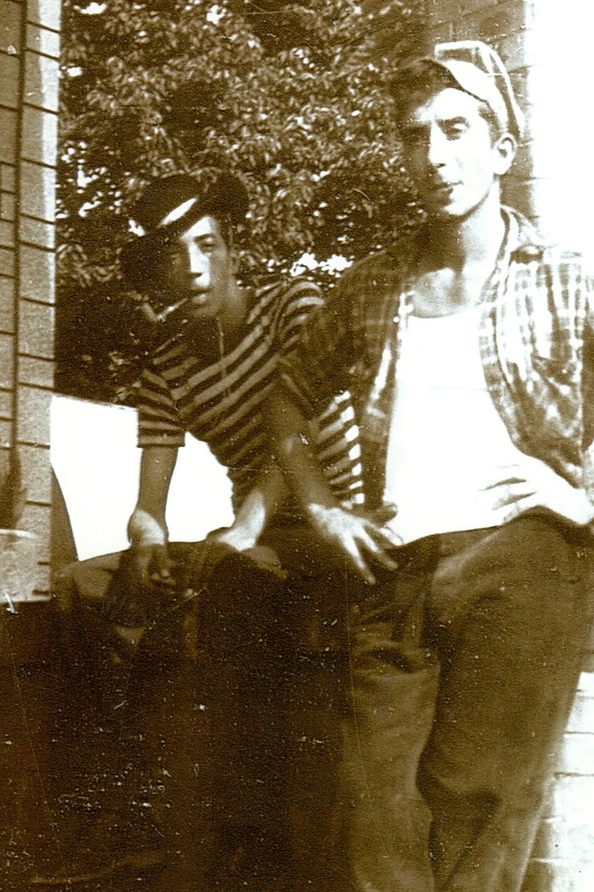 Humpie (sitting on left) and Charlie DeMarc Jr. smoking on the back porch of the DeMarc home. West Pittsburg, PA. c1948. |