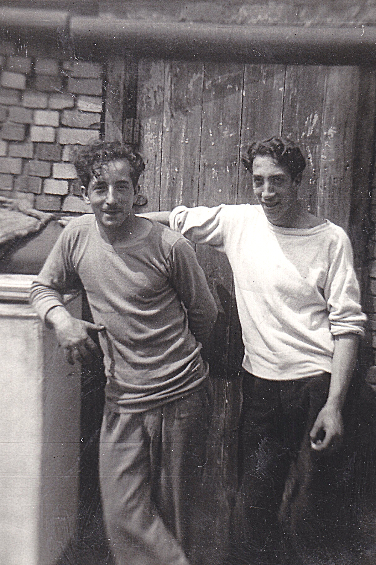 Humpie (on right) with his uncle George DeMarc. They are in front of the smoke house behind the DeMarc home. c1950. |