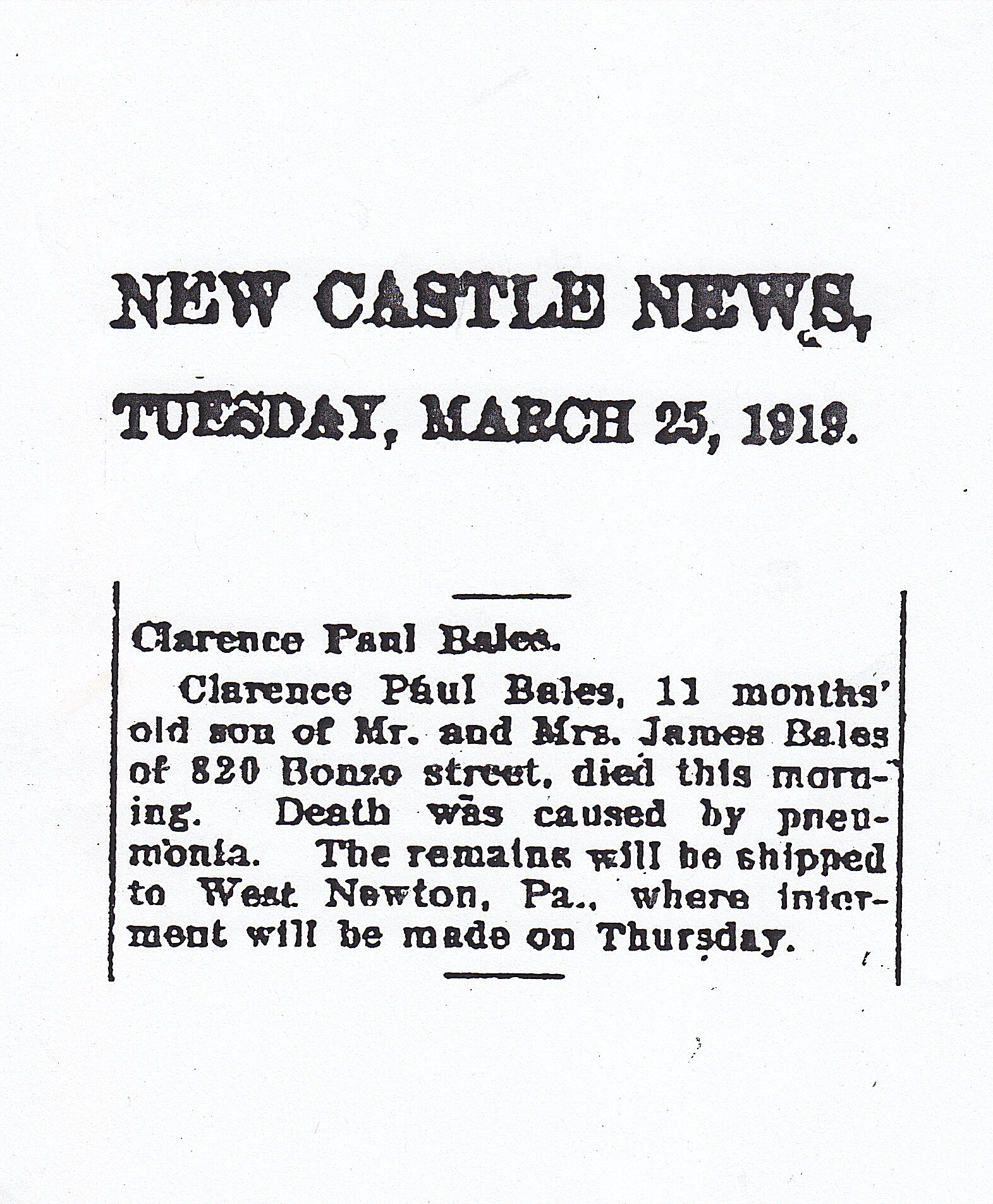 James Jamar Bales Jr. (probably known as Jim Jr.) was born in Westmoreland County, Pennsylvania, on February 15, 1909 - most likely in the town of West Newton. He was the third child born to James Jamar (“Jim”) Bales Sr. and Lydia Jane (Travis) Bales, a couple born and raised in southwestern Pennsylvania. James Jr., at the age of three years and four months, became quite ill after contracting rabies in mid 1912. Doctor John Buchanon of West Newton began treating him on June 15, but James died two days later at 4:30pm on Monday, June 17, 1912. His father bought a plot of four graves in West Newton Cemetery (Section #2 Lot #403) and little James was buried there on Wednesday, June 19. His grave is unmarked and the cemetery office mistakenly has him listed as “Jane.” Clarence Paul Bales was born on April 22, 1918, while the family lived at #820 Bonzo Avenue in New Castle, Pennsylvania. He was the sixth child of James Jamar Bales Sr. and Lydia Jane (Travis) Bales. Clarence, at the age of only eleven months, died on Tuesday, March 25, 1919, in New Castle, Lawrence County, Pennsylvania. His cause of death was listed as pneumonia and was sick about a month before he passed away. He was buried in the same plot as his brother James Jr. in West Newton Cemetery on Thursday, March 27. Parents James and Lydia were later buried alongside the two youngsters in 1954 and 1939 respectively, as was their brother John Merle Bales in 1982.