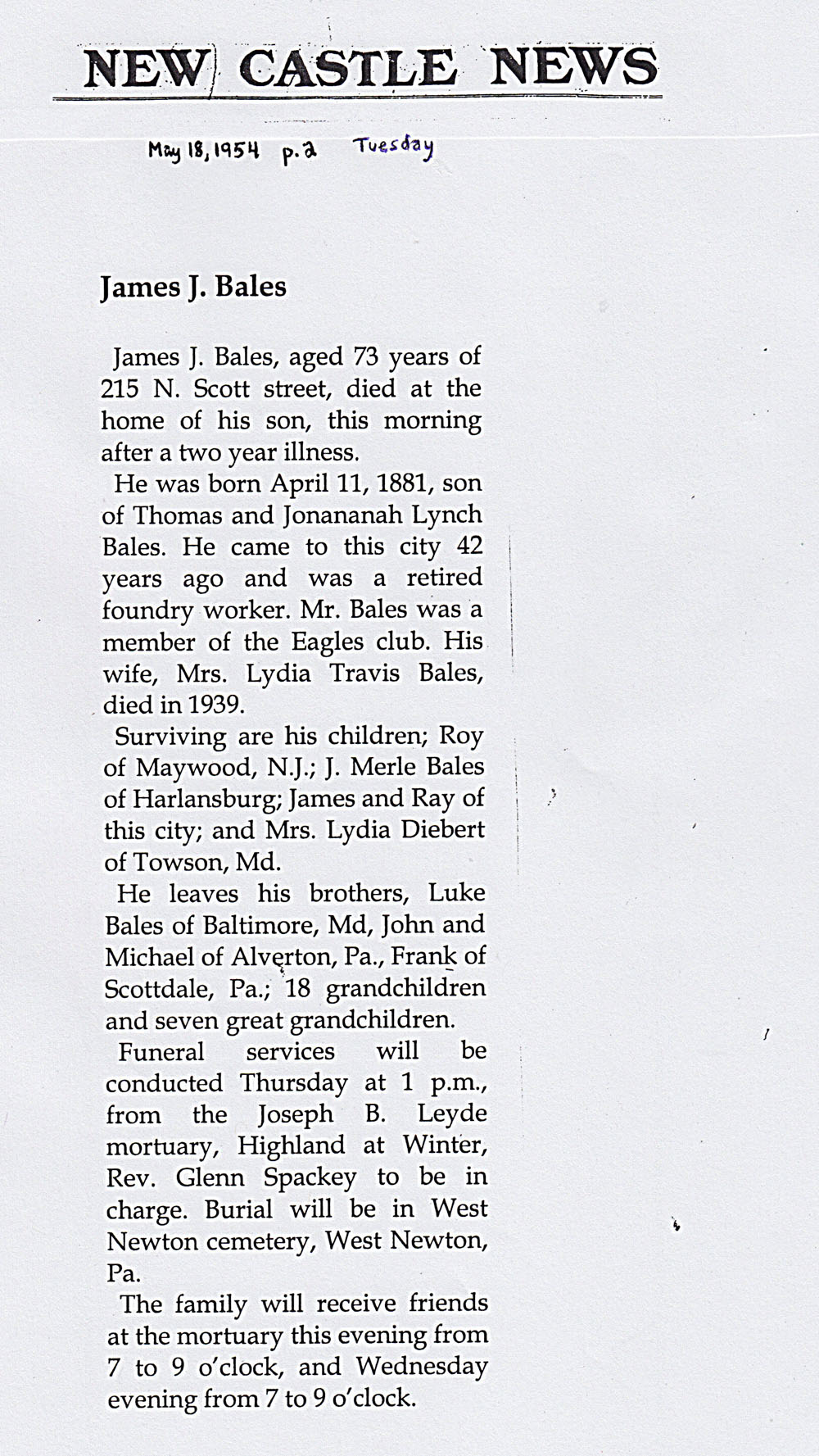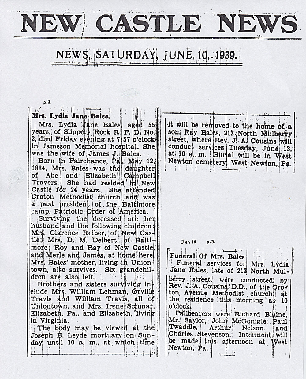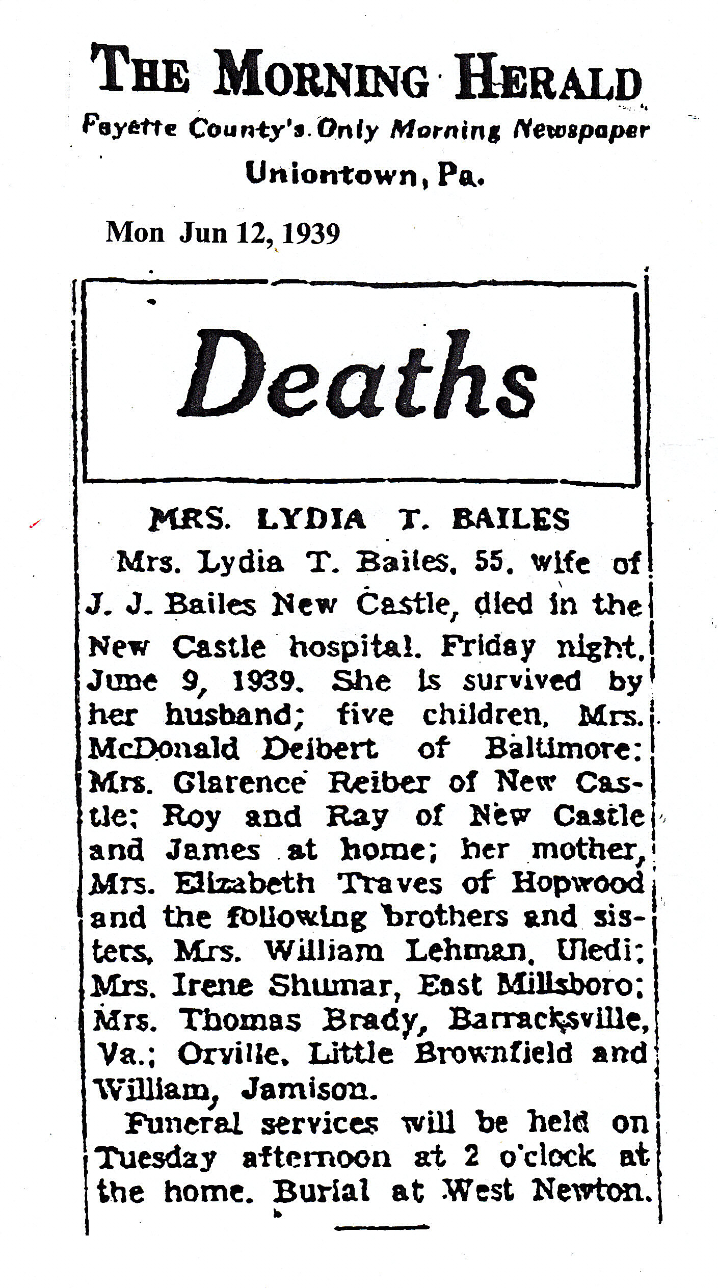 James Jamar “Jim” Bales, born April 11, 1882, and Lydia Jane Travis, born May 12, 1884, were both born and raised in the vicinity of Uniontown in southwestern Pennsylvania. The historic town of Uniontown, the county seat of Fayette County, is located about fifty miles southwest of Pittsburgh. Uniontown was founded as a small settlement in 1776, but grew steadily over the next few decades. The National Highway, also known as the Cumberland Road or simply “the Pike,” passed through Uniontown beginning in 1818 and brought great prosperity to the area. Anyone traveling by wagon train to Pittsburgh or points west passed through the thriving town. The coming of the railroad in the 1850’s, which basically bypassed Uniontown on the way to Pittsburgh, ended the importance of the National Highway (now modern-day Route 40) and of Fayette County in general. The iron and steel mills, later followed by the mass mining of coal, would become the top industries in the rebounding county. Jim Bales was the first child born to Thomas Bales and Johanna (“Hannah”) Lynch. (NOTE: In the 1800's the surname is often spelled as "Bailes," but the "I" is generally dropped altogether by the early 1900's). Jim’s exact place of birth is conflicting, but I believe he was born northeast of Uniontown in the small town of Mount Pleasant in neighboring Westmoreland County. Not much is known about his father Thomas, who was Scotch-Irish and born in either Pennsylvania or Northern Ireland. His mother Hannah, whose parents were both immigrants from Ireland, was born somewhere in northern Virginia. Thomas and Hannah, married about 1880-1881, spent time in Westmoreland County, but apparently settled in downtown Uniontown by the turn of the century. James, born in 1882, had five siblings, Margaret (“Maggie”) was born in 1887, John in 1889, Michael in 1893, Luke in 1895, and Frank in late 1900. Two other siblings died at birth or when they very young. Thomas Bales is somewhat of a mystery and disappears by the time son Frank is born. (NOTE: See Thomas Bales & Johanna Lynch page for more information). Lydia Jane Travis was the first child born to Abraham “Abe” Travis and Elizabeth Campbell. Lydia was born in Fayette County, but her place of birth is listed on different sources as Uniontown, Fairchance, or New Salem. Her father was born in Virginia (modern-day West Virginia) and he was the son of German immigrants. Her mother was born in Fayette County and descended from Irish or Scottish immigrants of an earlier generation. The 1900 U.S. Census (enumerated in June 1900) reveals the families of “Hannah Bailes” (minus husband Thomas) and “Abe and Elizabeth Travis” were neighbors in downtown Uniontown. I believe the families lived two houses/apartments away from each other near the intersection of Church Street and South Beeson Avenue. Hannah Bales was living with her five kids and was pregnant with son Frank. Oddly enough, the same census record reveals a “Martha Bailes,” age two, and listed as the niece of Abe Travis, living in the Travis household. At this time I am not sure who Martha’s parents are or why she is living with the Travis family. However, if she is the actual niece of Abe Travis (and related to our Bales’) that would mean that our Travis and Bales families were already joined by marriage at some earlier point. Jim Bales and Lydia Travis started dating and were married in the Fayette County courthouse in downtown Uniontown on May 29, 1903. Jim’s mother Hannah was soon remarried to Irish coal miner James Delaney and moved to East Huntington Township, Westmoreland County. Jim was employed as a molder or foundry man with National Radiator and eventually served as a supervisor. At that time the manufacturing of steam radiators, used for the heating of homes and businesses, was a booming industry. His career field saw them move every so often as he would be tasked to help straighten out other factories. The next thirty years or so was a period of constant movement for Jim and Lydia. Their first child, Pansy Marie, was born in Uniontown on January 5, 1905. They apparently moved up north to the neighboring county of Westmoreland soon after as their second child, Lydia Jane, was born in the town of Hunker in May 1906. Another child, a son named James Jr. (“Jim”), was born in Westmoreland County in February 1909. By April 1910, the Bales family was residing on Main Street in the town of West Newton in Westmoreland County. While they celebrated the birth of a second son, Roy Kenneth, in September 1911, the family suffered a tragedy the following June as son Jim Jr. died of rabies before reaching the age of four. He was buried in an unmarked grave in West Newton Cemetery. The family was living in Canton, Stark County, Ohio, by 1915 and son Ray Daniel was born in Canton on March 6, 1915. The family was soon living in New Castle, Lawrence County, Pennsylvania, where another son named Clarence Paul was born in April 1918. It is known that Clarence died of pneumonia in New Castle in March 1919. He was buried next to his brother in West Newton Cemetery. During this time the family was living at #820 Bonzo Avenue in New Castle, but not for long. The family was renting a home at #1520 Thorn Street in the city of Utica, Oneida County, New York, by January 1920. According to the 1920 U.S. Census records Jim was employed as a foreman at a “Heater Works.” Their stay in upstate New York was short-lived as they were back in New Castle soon after. In April 1920, Jim bought a house from Grace Rutland, the daughter of John and Rose (Bolinger) Reiber, off of East Maitland Road near East Brook in Hickory Township. (NOTE: The house is gone but it was right near where Hanna Lane is now located.) It was during this time that the family had two large Airedale Terriers. Jim and Lydia had two more sons while residing in the East Brook area, John Merle (“Merle”) was born in April 1920 and James Jamar 