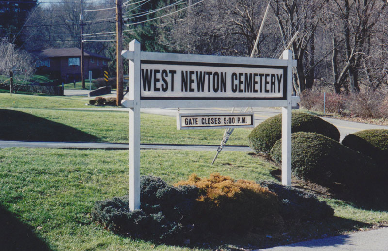 Entrance sign for West Newton Cemetery, West Newton, Fayette Co., PA. Dec 2006. |