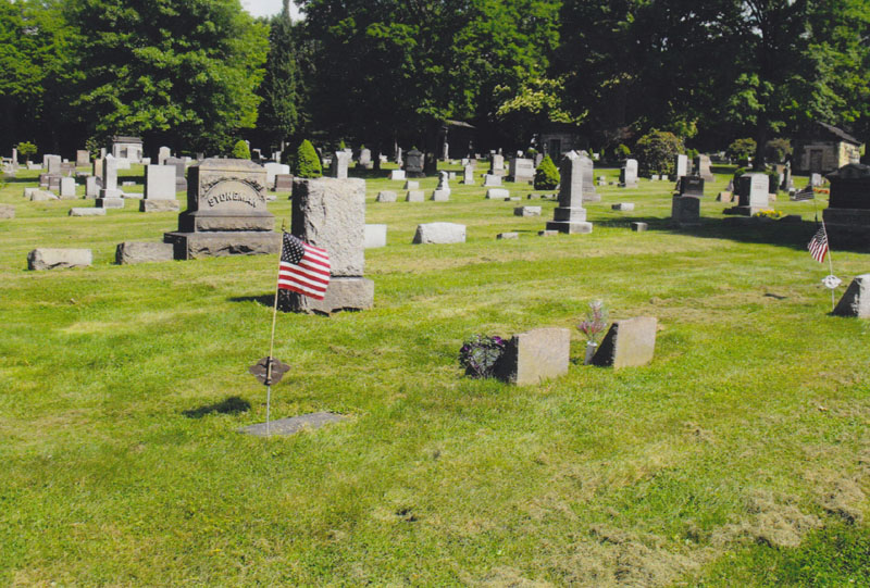 Merle's marker at bottom with veteran's staff and flag. The two headstones of his parents Jim and Lydia sit above and to the left. In the unmarked plots between them is the final resting place of Merle's infant brothers James and Clarence. Jun 2009. |