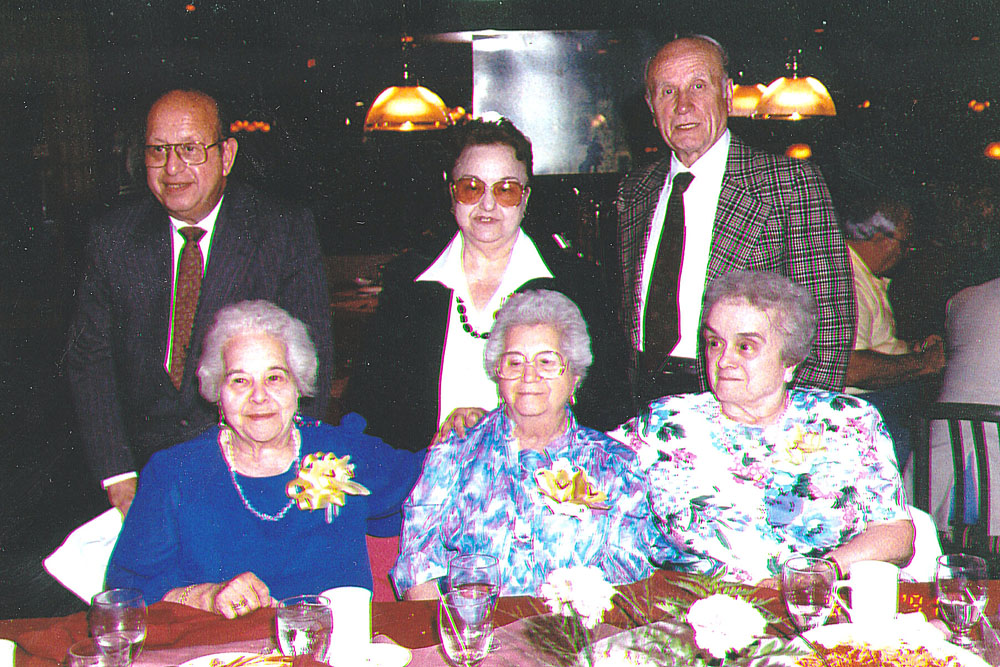 At a surprise birthday party for Josephine. Josephine on bottom left with her sisters Madeline and Rose. back row from left is her son Pat, her daughter Tillie, and unidentified. |