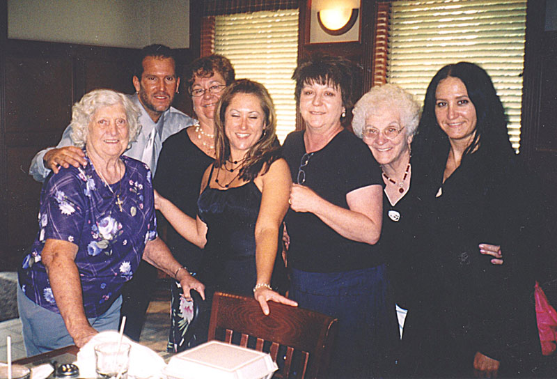 From left: Josie Teck, Jeff Bales Jr., Shirley Perry, Alison Bales, Mary Kaye Alfera, Kay (sticking her head in), and Carol Bales. Day of Irene LaPatka DeMarc's funeral service. Jul 2007. |