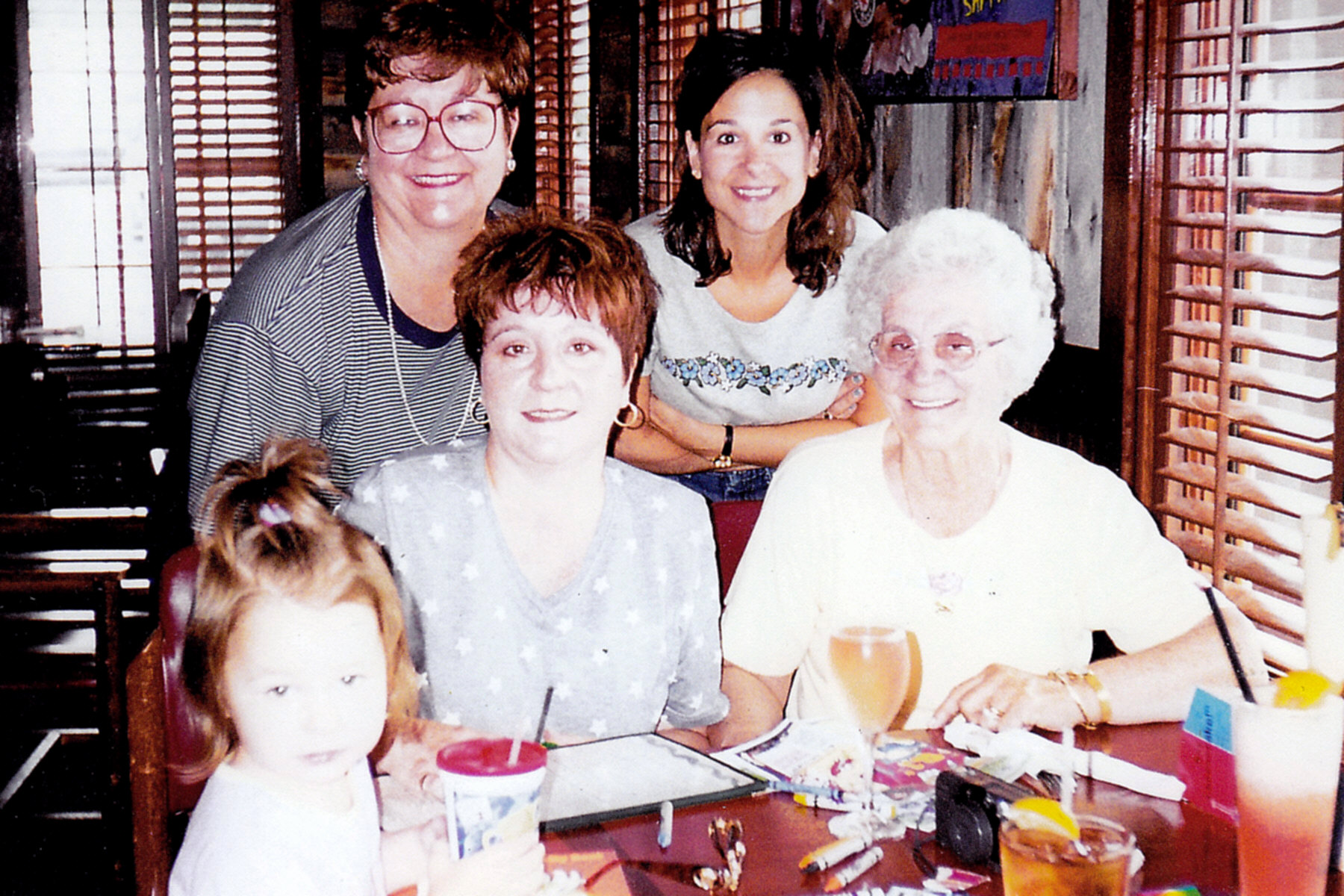 I believe this was a lunch for Kay's 80th birthday. From left its youngster Megan O'Donnell, Shirley Perry, Mary Kaye Alfera, Valerie O'Donnell, and Kay. cJul 2000. |