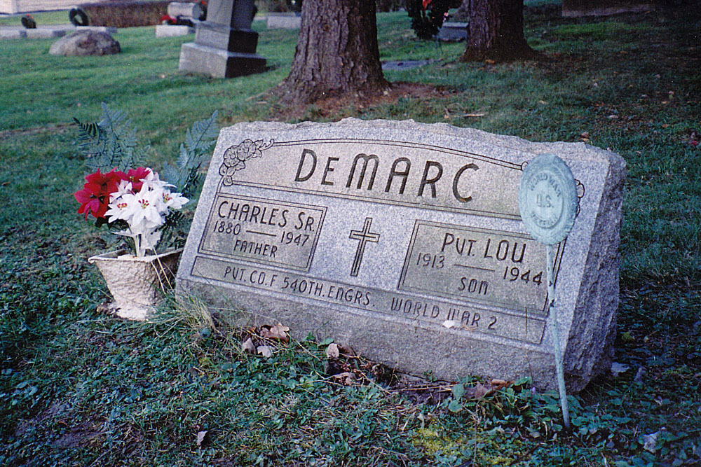 DeMarc stone. Lou and his father are buried side by side and share the same stone. Inscription on bottom is for Lou and reads, "PVT. CO. F 540TH ENGRS WORLD WAR 2." Dec 2006. |