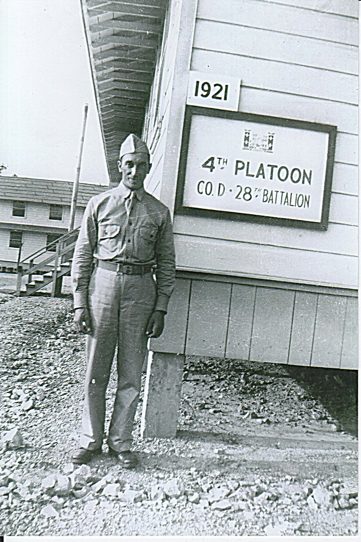 Lou, standing alongside a barracks, after being inducted into the U.S. Army. Unknown location. 1942. |