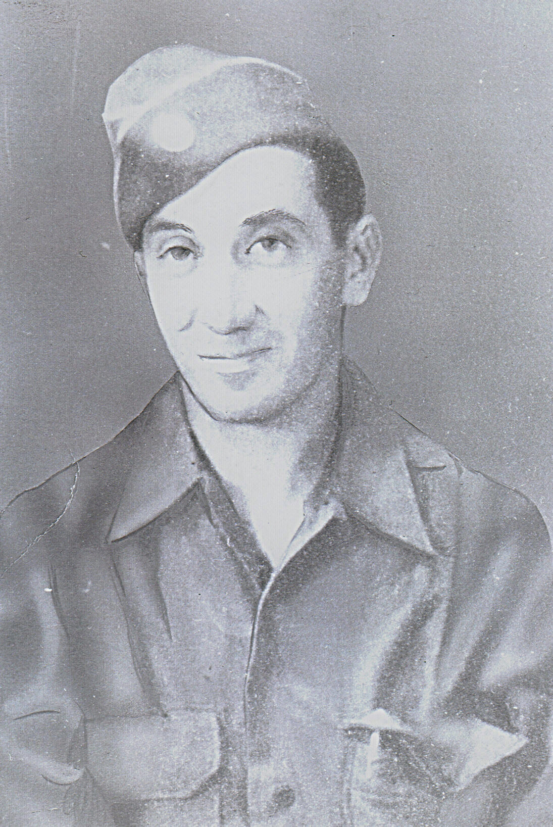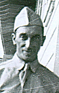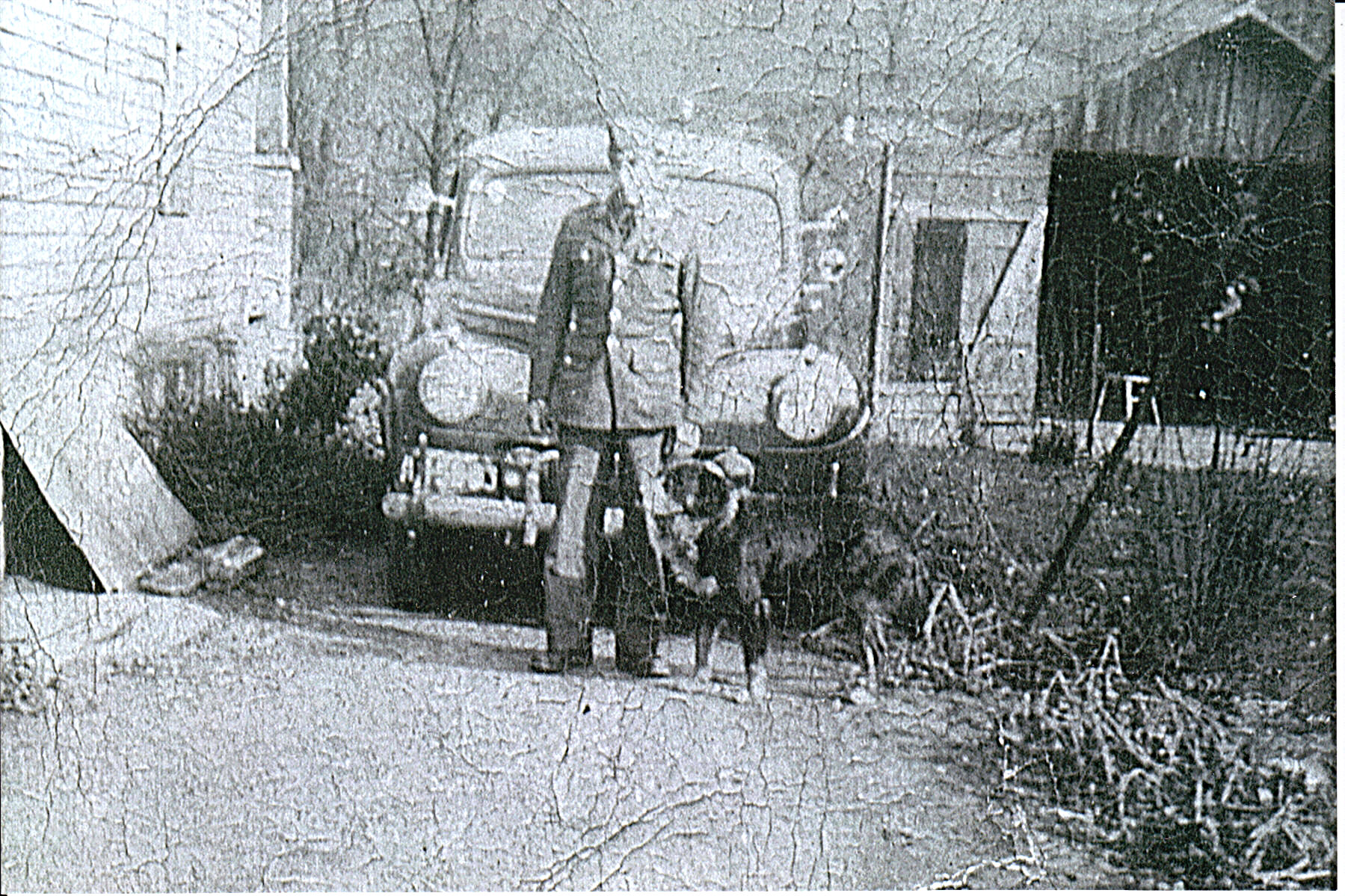Lou in uniform at the DeMarc home in West Pittsburg. The dog is named Shep and belonged to his brother Charlie. This is prior to being deployed overseas in October 1942. |