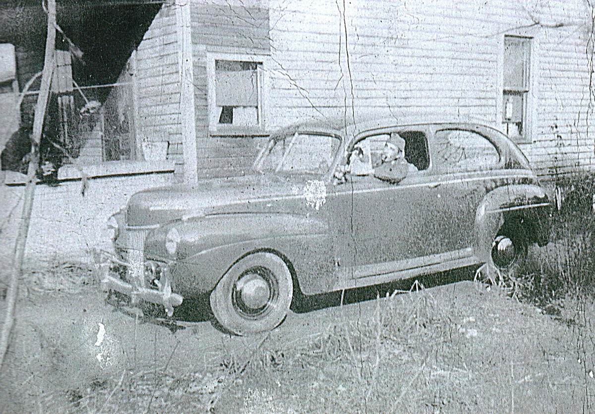 Lou in his car alongside the DeMarc home. There is a man (obscured) in a black coat on porch that may be Charles DeMarc Sr. or Tony "Chingi" Chiarelli. |