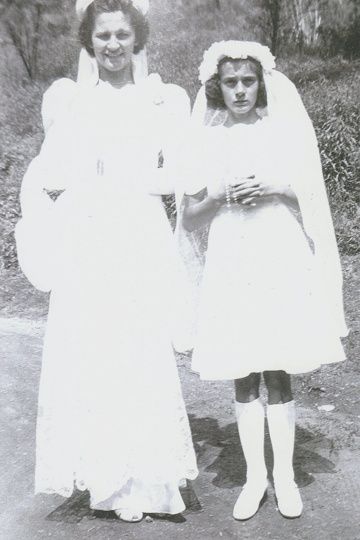 Pauline at age 15 (on right) with her sister Kay on day of Kay's wedding. Pauline had her first communion the next day. Jun 1940. |