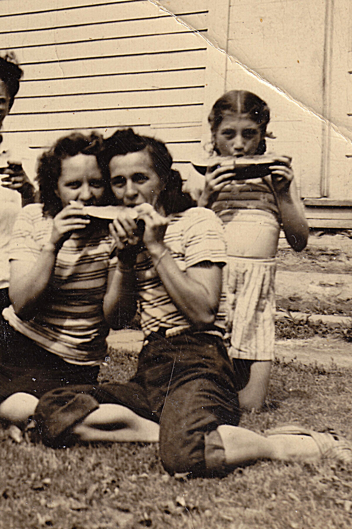 From left its Stella (Borsuk) LaPatka, Pauline, and Carol Grace Aiello eating watermelon. 1947. |