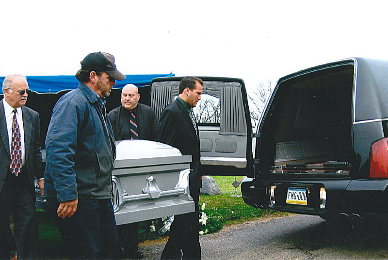 Jeff Bales Jr. (right) and Ray "Danny" Bales III (background) help carry Pap's casket at the cemetery. Nov 2006. |