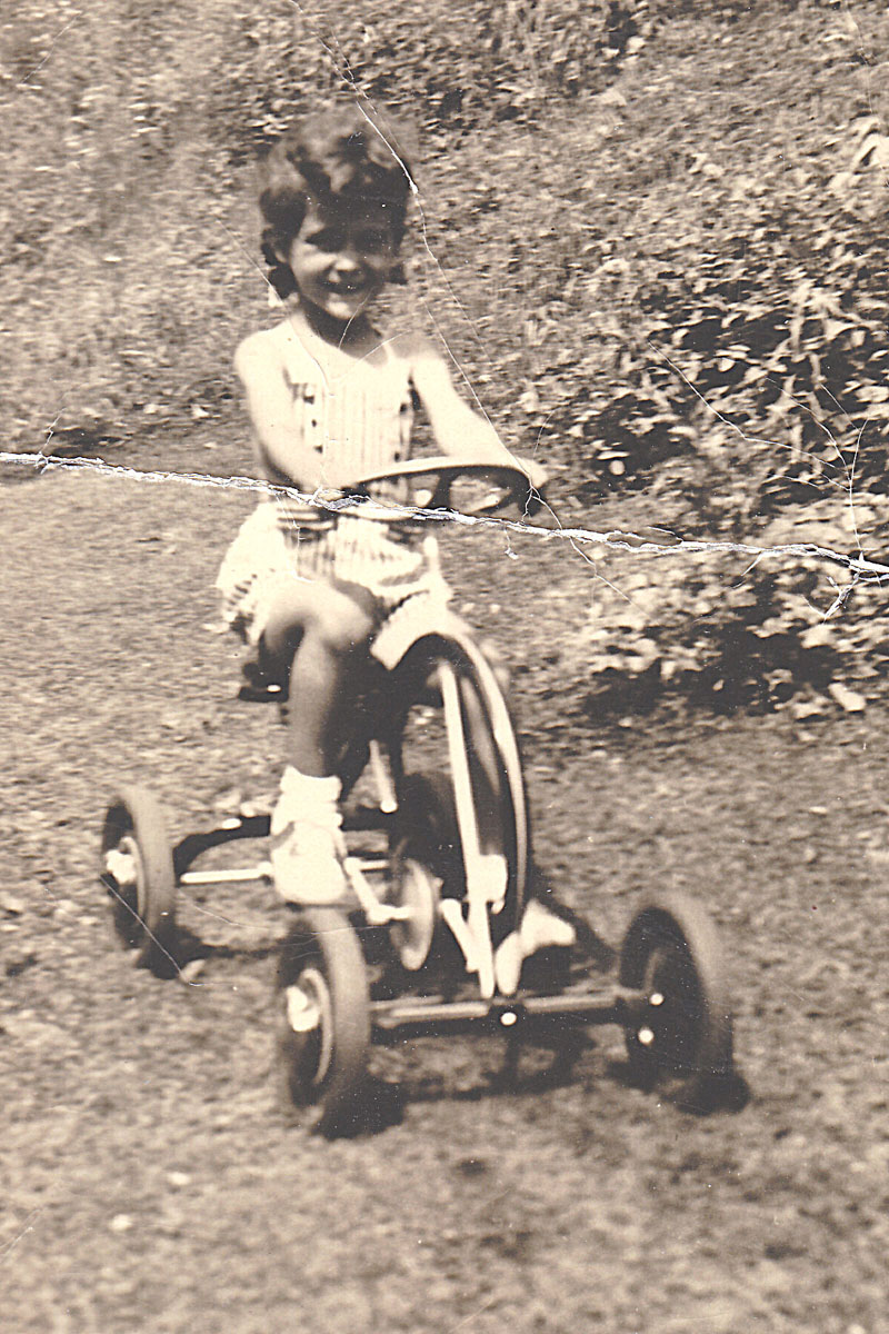 Shirley riding a four-wheel bike. c1945. |