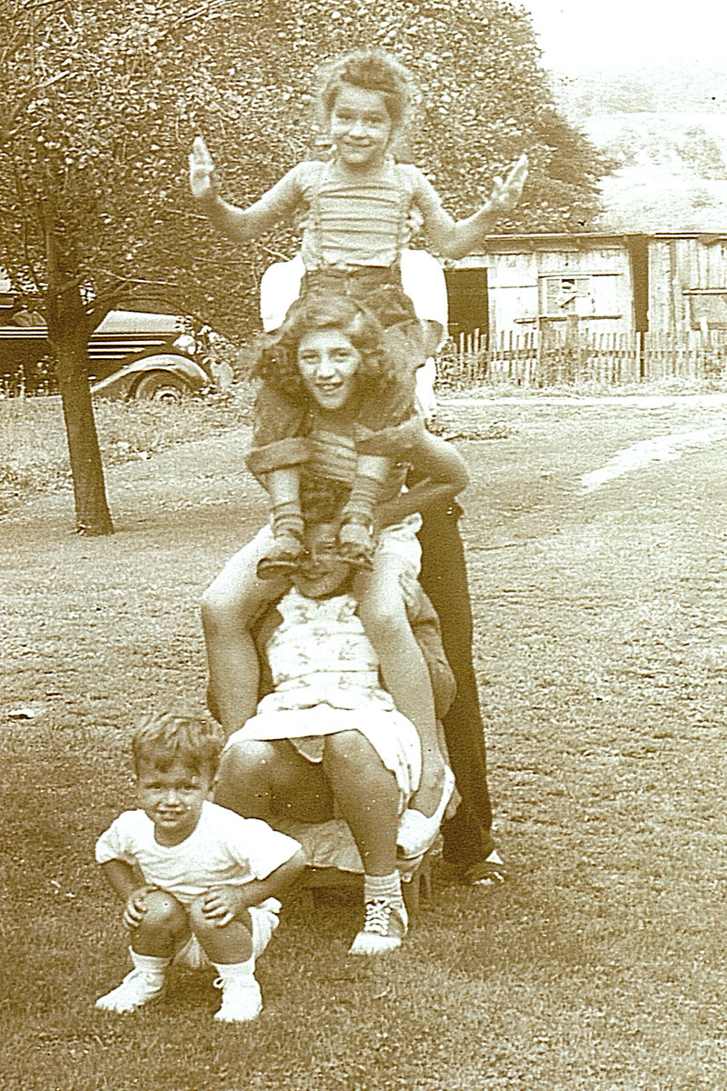 Shirley riding high on top. Others are Ronnie Teck, Patty LaPatka, and Carol Grace Aiello. An unknown stands behind (barely visible) to steady the pile. LaPatka farm. Chewton, PA. c1949. |