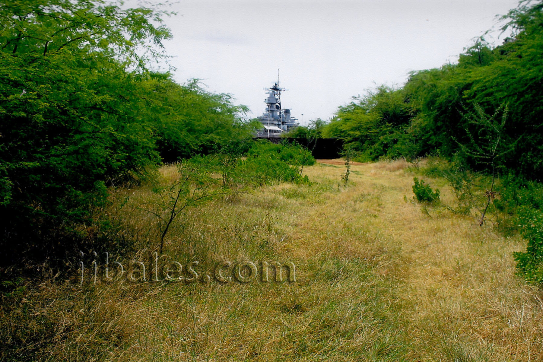 As you continue on towards the east this is what you see if you look back. The massive battleship Missouri, on whose decks the official Japanese surrender took place on September 2, 1945, dominates the view. The rusted bleachers are still visible to the right.