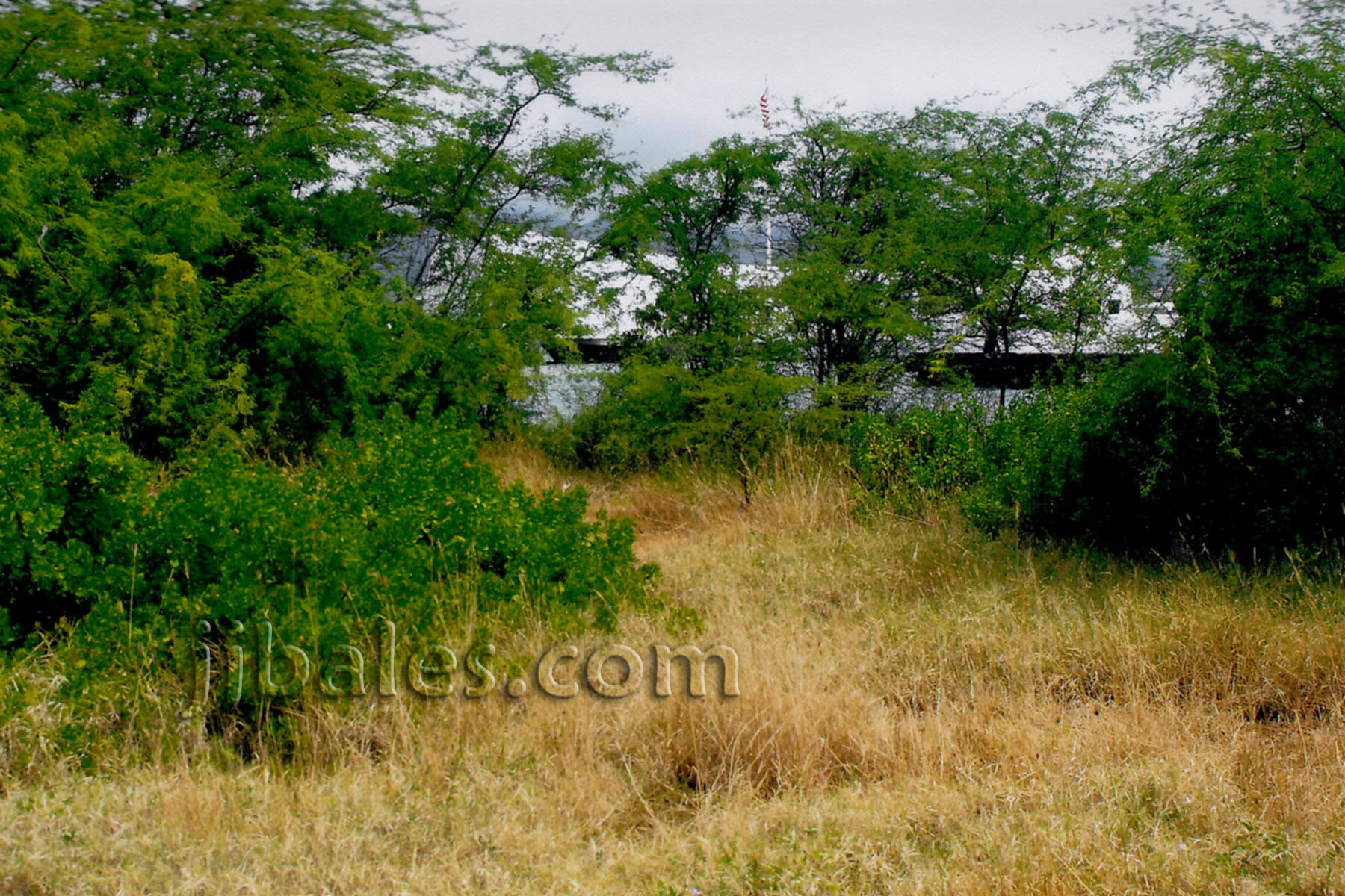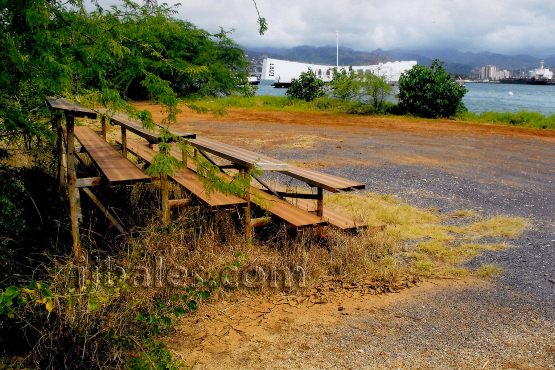 Standing next to the bleachers you can see the Arizona Memorial slightly obscured by some trees along the shoreline.