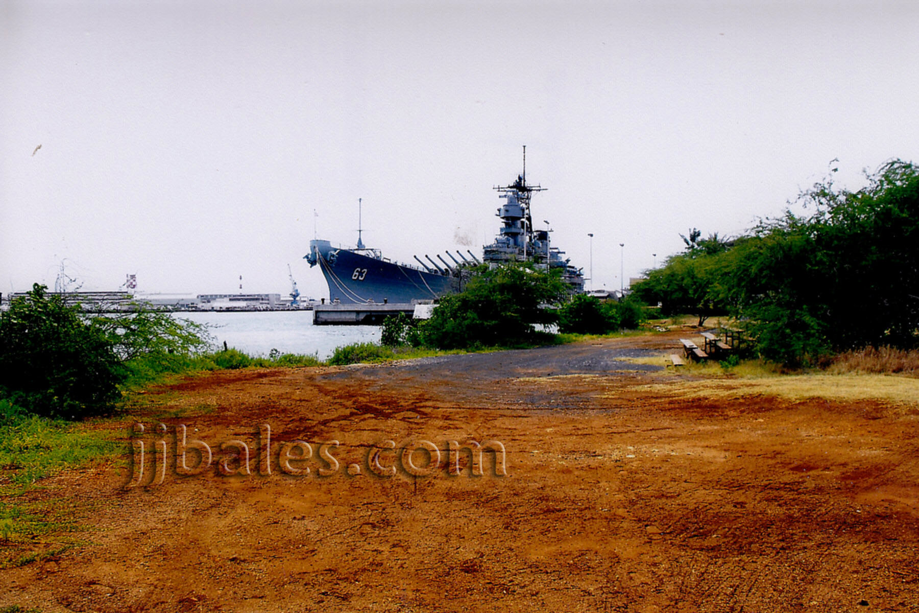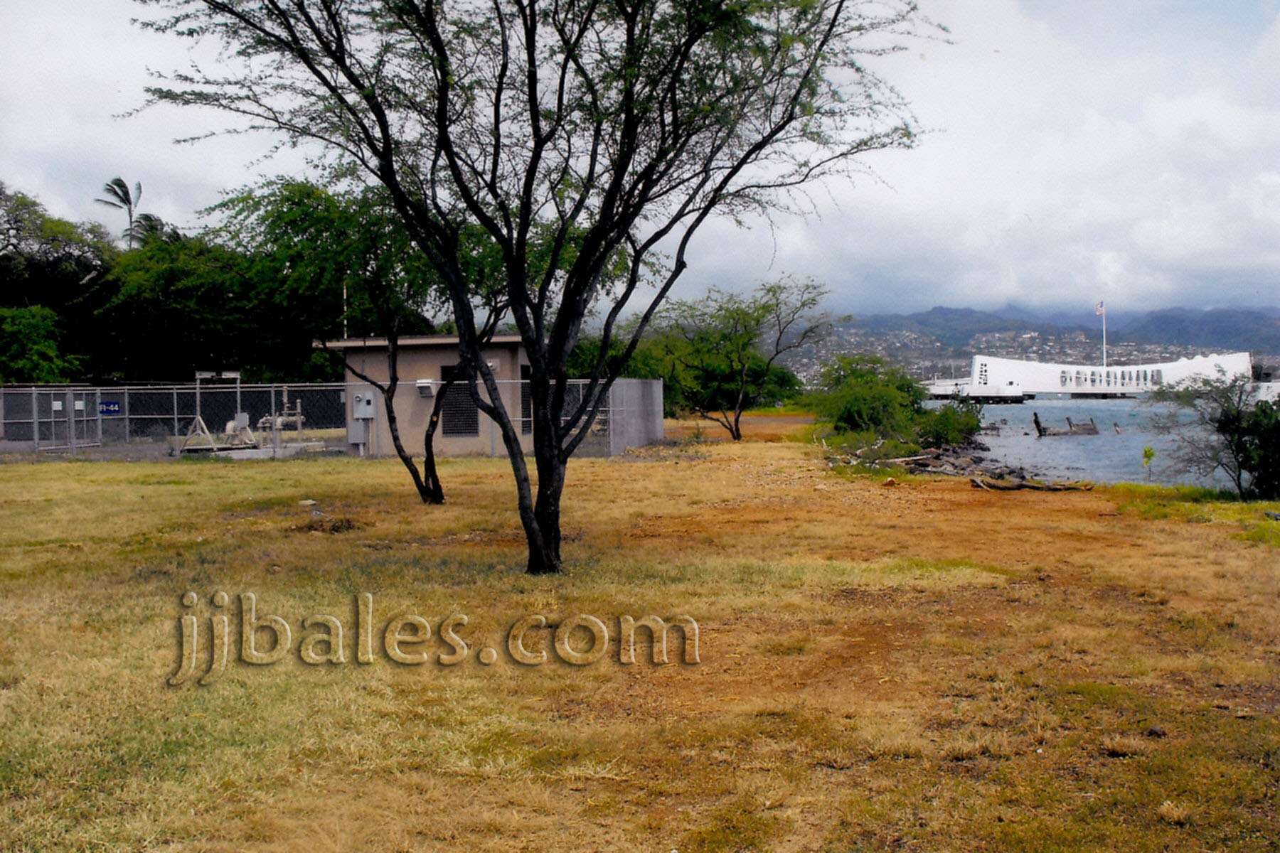 The battleships Tennessee and West Virginia were berthed at this location back on December 7, 1941. The stern of the Tennessee was tied to that the white mooring quay visible just offshore.