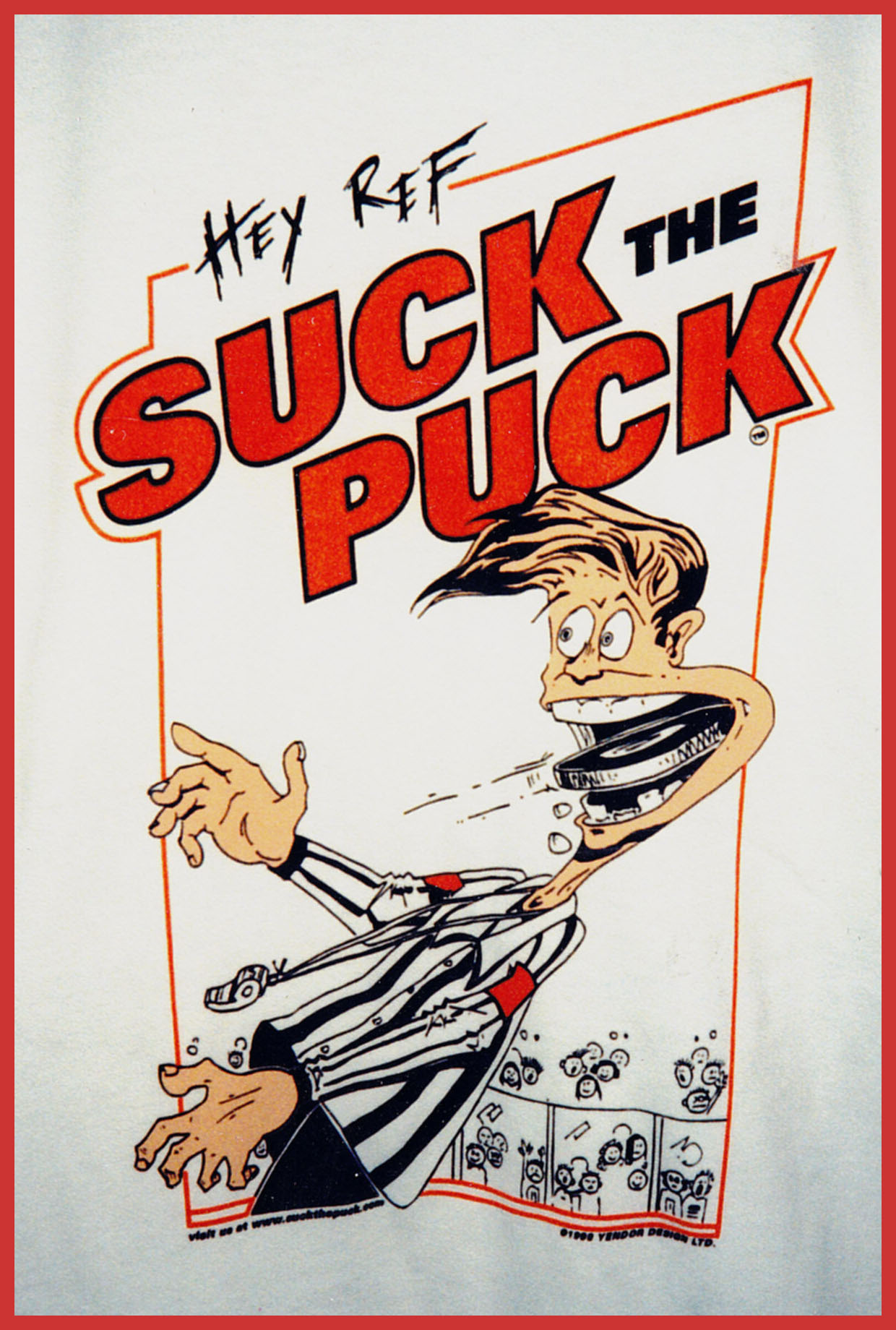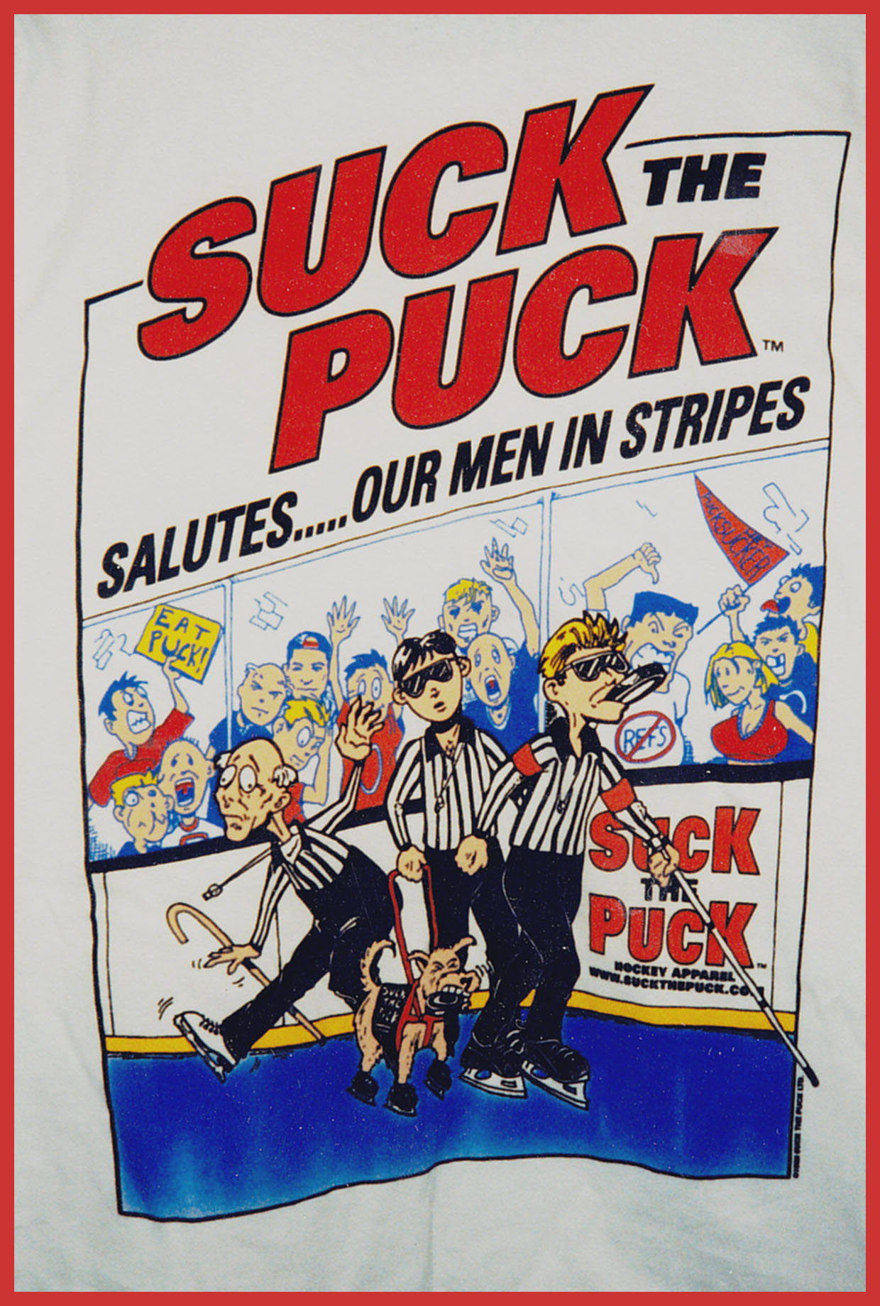 "Several years ago me and my friend Rodney came up with an idea to sell comedic sports-themed t-shirts. We came up with an idea for a hockey t-shirt with a ref taking a puck to the mouth. We visited the Baltimore home of the founders of the successful Big Johnson t-shirt line (the Pfeifer brothers at Maryland Screen Printers) and got some valuable advice and assistance. We ended up designing and printing three separate t-shirts and they were a big hit among hockey players. We loved the research and development stage - from the initial idea to a finished product - but we were not much in the way of salesmen. Our inventory is still ample and once again we will be selling these bad boys! They will be available for purchase right here in the near future."